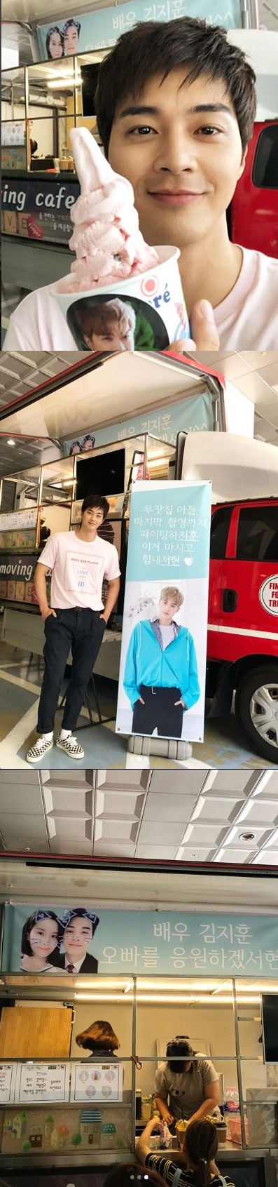 사진 속 김지훈은 아이스크림 컵을 들고 카메라를 바라보고 있다. 그의 훤칠한 키와 잘생긴 외모가 돋보인다. 간식차 현수막에 쓰인 "김지훈 오빠를 응원하겠서현"이라는 문구가 눈길을 사로잡는다.
