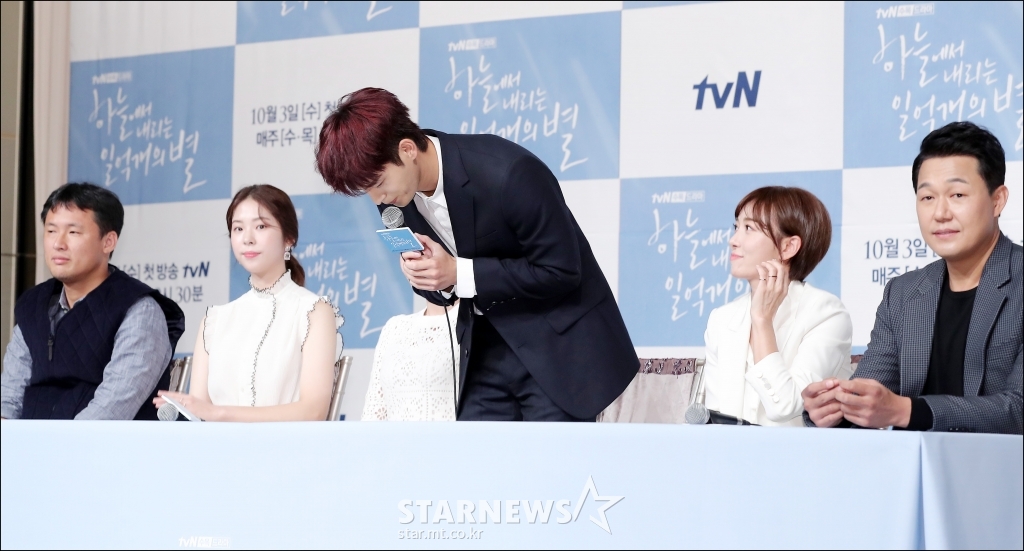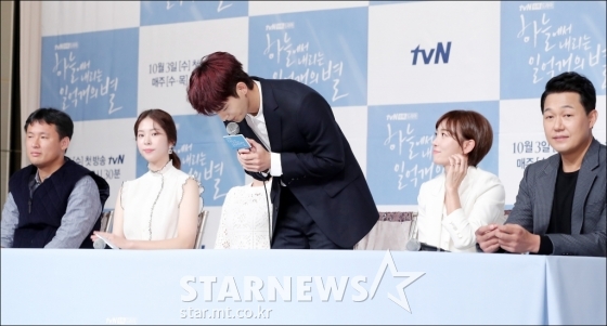 배우 서인국이 28일 오후 서울 영등포구 타임스퀘어 아모리스홀에서 열린 tvN 수목드라마 '하늘에서 내리는 일억개의 별' 제작발표회에서 인사말을 하고 있다.'하늘에서 내리는 일억개의 별'은 괴물이라 불린 위험한 남자 무영(서인국 분)과 그와 같은 상처를 가진 여자 진강(정소민 분) 그리고 무영에 맞서는 그녀의 오빠 진국(박성웅 분)에게 찾아온 충격적 운명의 미스터리 멜로다. 오는 10월 3일 첫 방송.