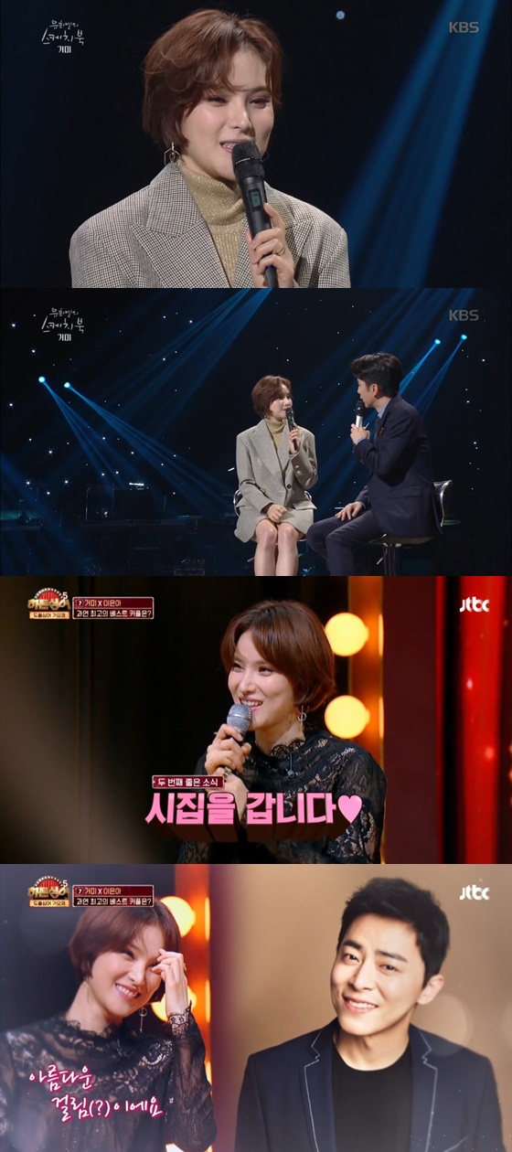 여기에 그치지 않고 거미는 지난 7일 오후 방송된 종합편성채널 JTBC 예능 프로그램 '히든싱어5' 도플싱어 가요제편에 출연해 결혼 소식을 발표했다. 거미는 모창 능력자 이은아와 함께 '어른아이' 무대를 끝낸 뒤 MC 전현무와 대화를 나눴다. 전현무는 거미를 향해 "가을에 좋은 소식 있죠?"라고 질문했다. 이에 방청객들은 환호성을 질렀고, 거미는 당황한 모습을 보였다. 거미는 "다른 생각을"이라며 웃었다.