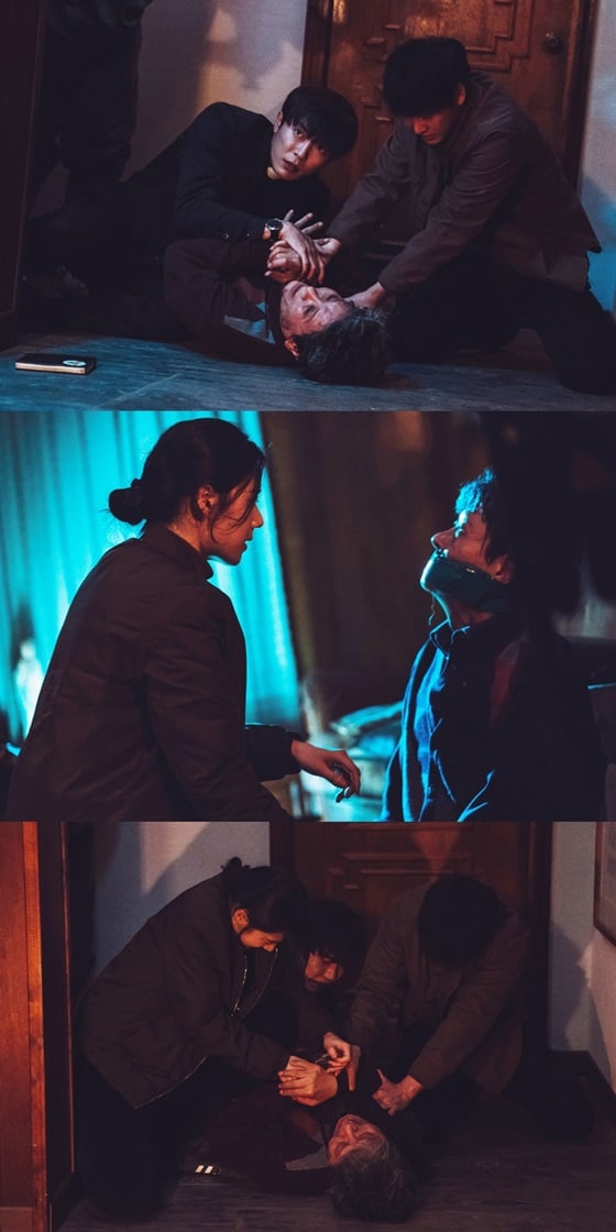 드라마 '손 더 게스트(손 the guest)'에서 김동욱, 김재욱, 정은채가 최후의 격전을 남겨두고 강력한 박일도의 힘에 필사적으로 맞선다.