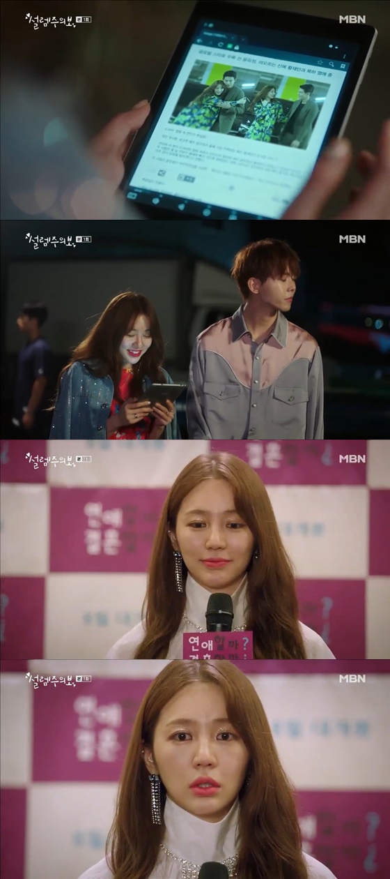 지난달 31일 오후 방송된 종합편성채널 MBN 새 수목드라마 '설렘주의보'(극본 김신혜, 연출 조창완)에서는 윤유정(윤은혜 분)이 드라마 제작발표회에서 황재민(최정원 분)과의 열애 사실을 인정하려고 하는 모습이 전파를 탔다.