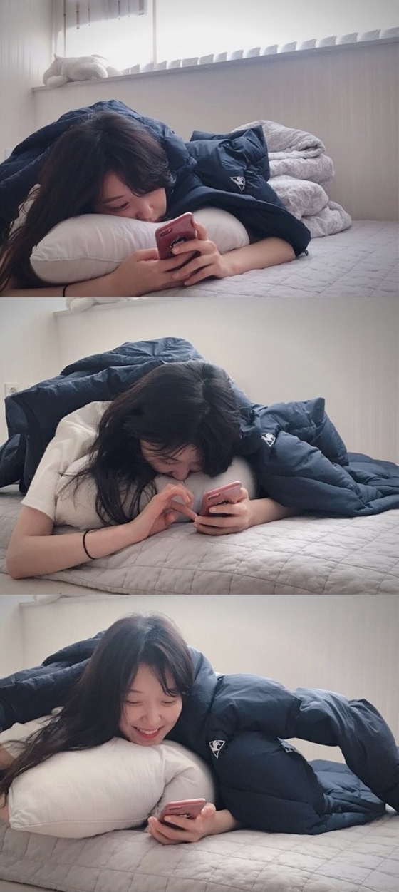 사진 속 조우리는 침대에 누워 휴대전화를 만졌다. 평범한 일상이지만, 조우리의 청순한 매력이 눈길을 끈다.