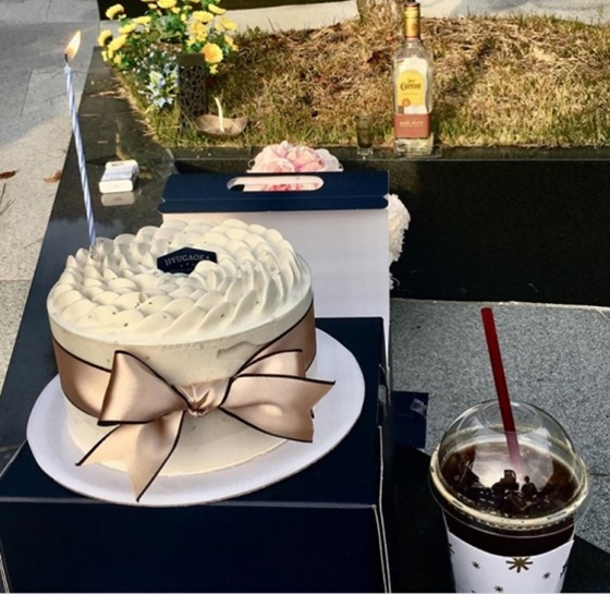 공개된 사진에는 초가 꽂힌 케이크, 커피, 담배, 양주가 묘소 앞에 놓여있다. 이는 조민기가 생전 좋아했던 것이다.