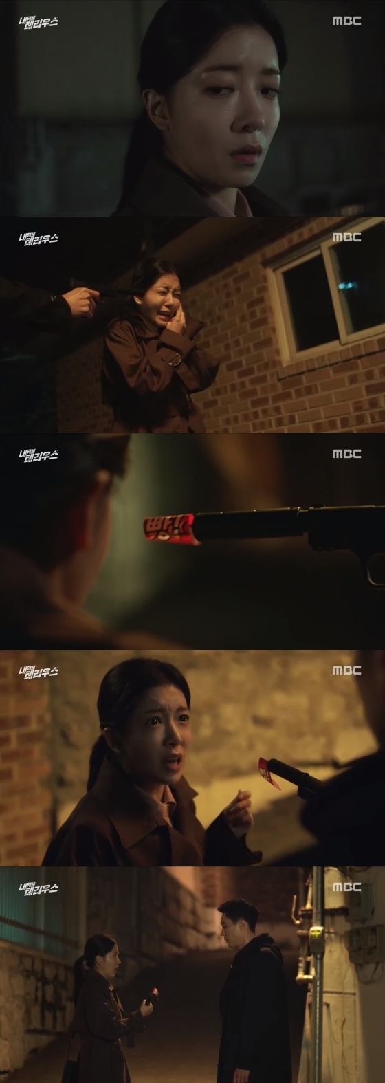 8일 오후 방송된 MBC 수목 드라마 '내 뒤에 테리우스'(극본 오지영, 연출 박상훈·박상우, 제작 MBC·몽작소)에서는 고애린(정인선 분)의 머리에 장난감 권총을 겨눈 김본(소지섭 분)의 모습이 그려졌다.