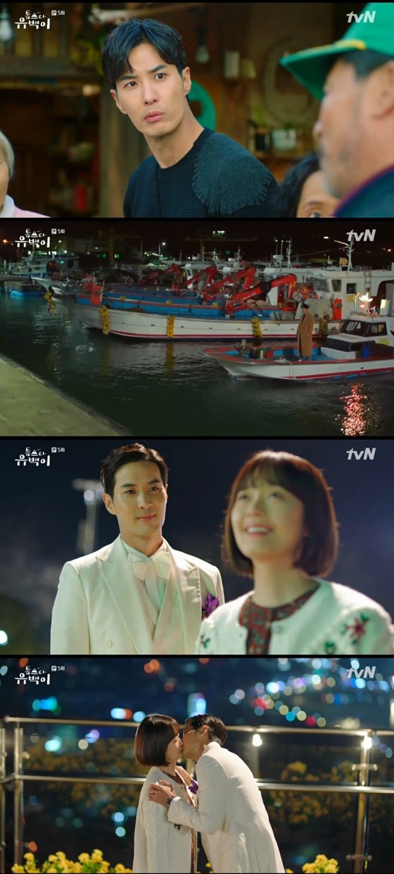 이후 유백은 파도를 뚫고 대즉도로 갔다. 모텔에 들어가는 오강순과 최마돌의 뒷모습을 보고 망연자실한 모습을 보였다. 모텔에 들어가는 오강순과 최마돌의 뒷모습을 보고 망연자실한 모습을 보였다. 그러나 유백은 사람을 시켜 오강순을 한 장소로 데려오게 했다. 장소에 도착한 오강순은 "톱스타씨? 이게 다 뭐데요?"라고 말하며 놀란 모습을 보였다. 유백이 손짓하자 폭죽이 터지면서 하늘에 불꽃으로 수가 놓여졌다. 이를 본 오강순은 미소를 지었다. 유백은 "난 겨울에도 꽃을 피우게 할 수 있다. 나의 프레임 안에 오강순이라는 여자를 머물게 해주는 거다. 축하해 오강순"이라고 말하며 첫 키스를 했다.