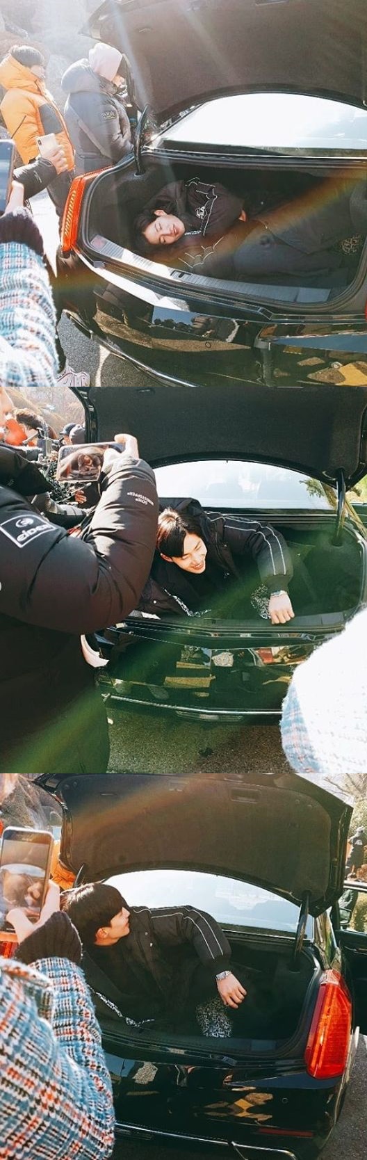 배우 송재림이 자동차 트렁크에 숨은 사진을 공개했다.