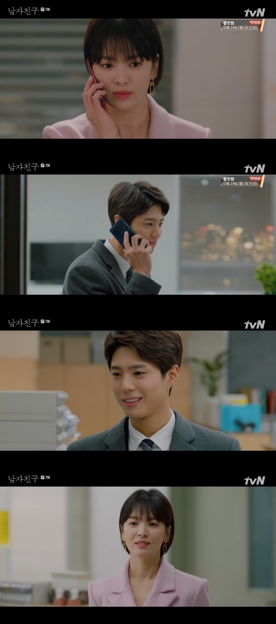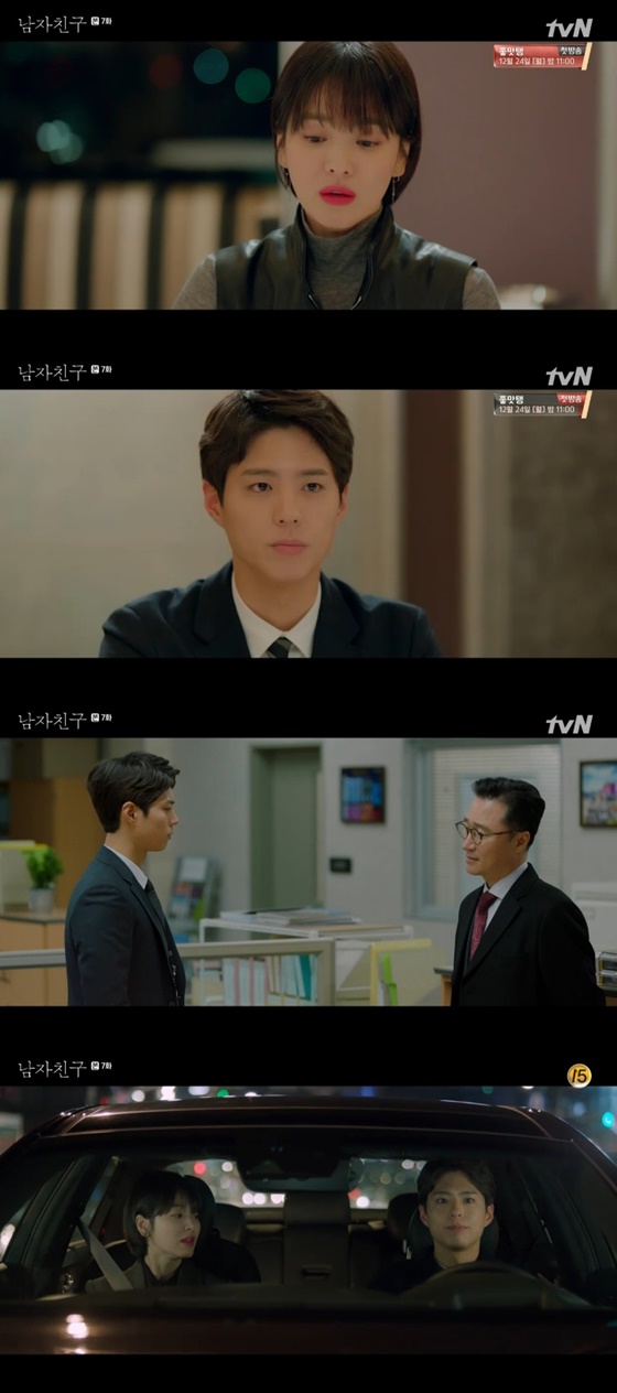 지난 19일 오후 방송된 케이블채널 tvN 수목드라마 '남자친구'(극본 유영아, 연출 박신우, 제작 스튜디오드래곤·본팩토리)에서는 차수현(송혜교 분)이 김진혁(박보검 분)에게 직진하는 모습과 갑작스런 인사 발령 소식에 분노한 모습이 전파를 탔다.