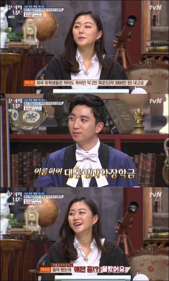 7일 오후 방송된 tvN 예능프로그램 '뇌섹시대-문제적 남자'에서 영국 케임브리지 대학교 대학생 이수린, 신준하가 게스트로 등장했다.
