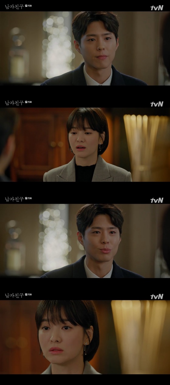 23일 오후 방송된 케이블채널 tvN 수목드라마 '남자친구'(극본 유영아, 연출 박신우, 제작 스튜디오드래곤·본팩토리)에서는 차수현(송혜교 분)이 김진혁(박보검 분)에게 헤어지자고 말하는 모습이 그려졌다.