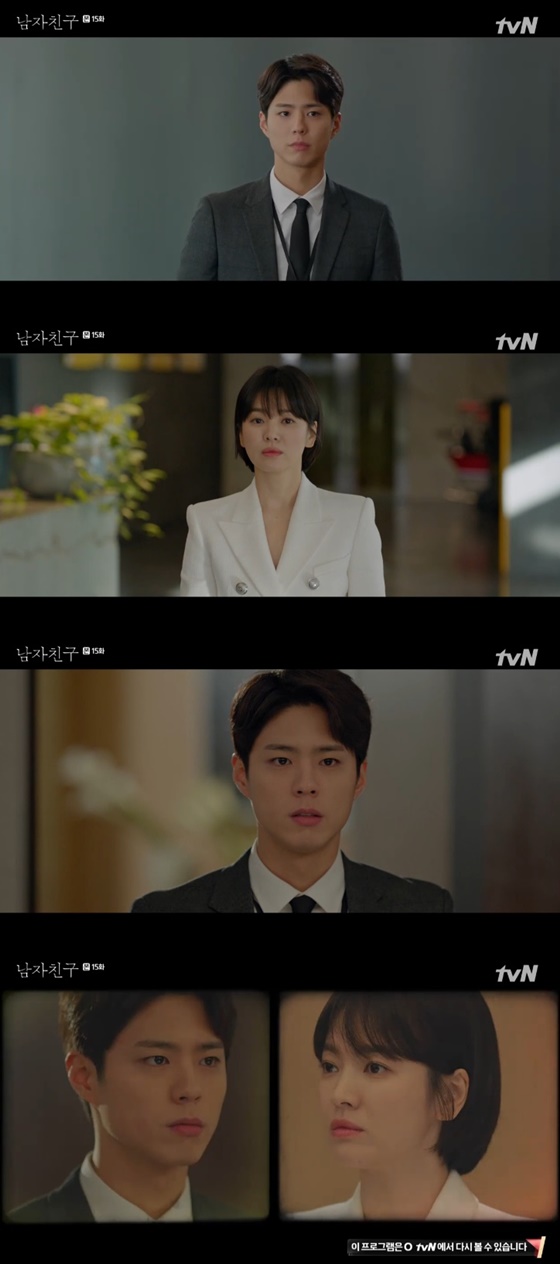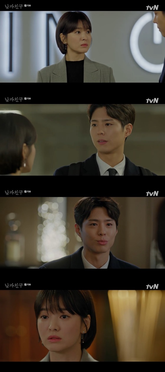 23일 오후 방송된 케이블채널 tvN 수목드라마 '남자친구'(극본 유영아, 연출 박신우, 제작 스튜디오드래곤·본팩토리)에서는 차수현(송혜교 분)이 김진혁(박보검 분)에게 이별을 고하는 모습이 그려졌다.