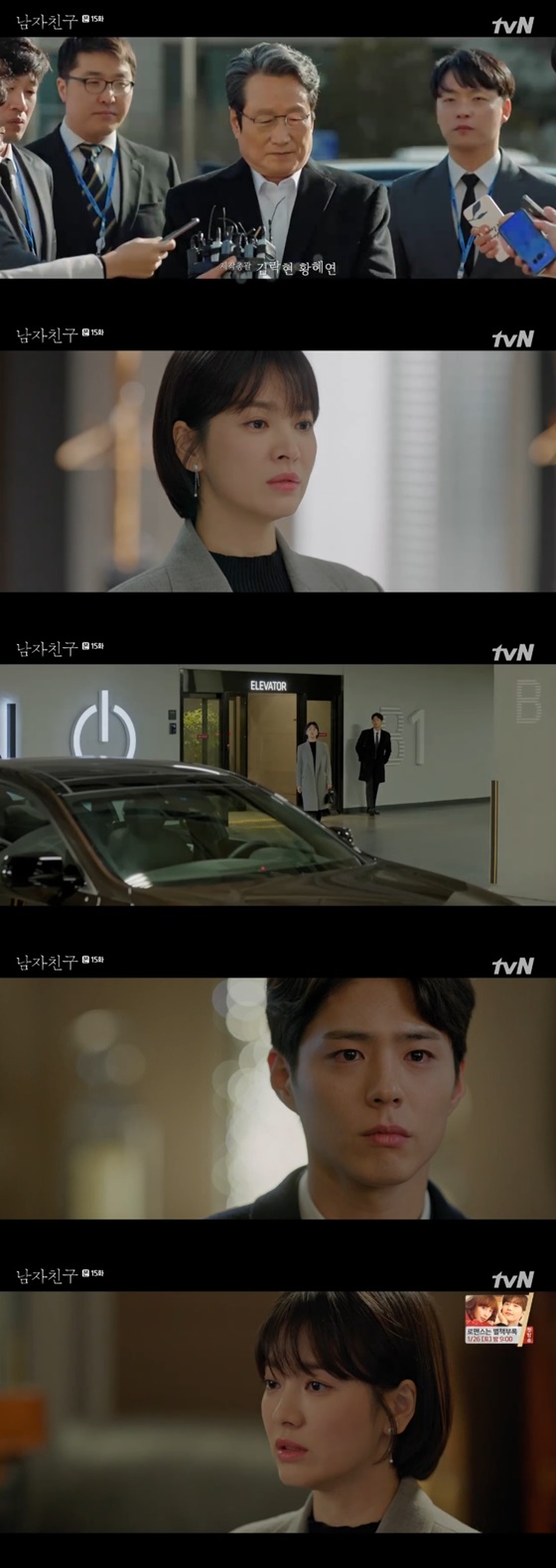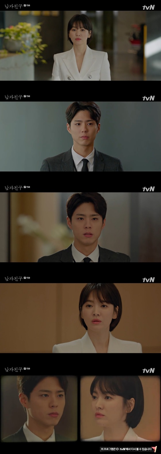 지난 23일 오후 방송된 케이블채널 tvN 수목드라마 '남자친구'(극본 유영아, 연출 박신우, 제작 스튜디오드래곤·본팩토리)에서는 차수현(송혜교 분)이 김진혁(박보검 분)에게 이별을 고하는 모습이 그려졌다.