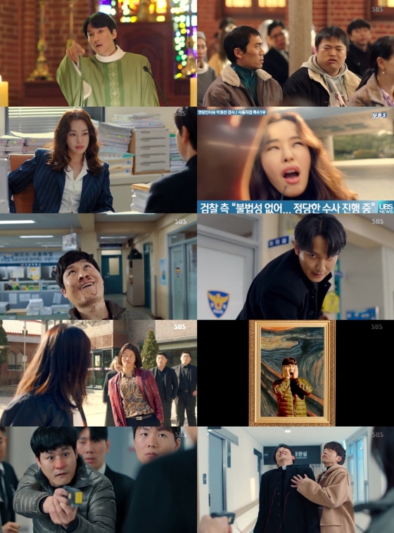성당 식구들을 괴롭히는 단발머리 깡패 장룡(음문석 분). 그를 발차기 한 방으로 제압하는 신입 형사 서승아(금새록 분). 이에 경악하는 선배 구대영의 모습이 연이어 시선을 강탈했다. 특히 아무도 예상 못한 순간 나온, 뭉크의 '절규'를 연상시키는 코믹한 패러디는 안방극장에 깜짝 웃음을 선사했다.