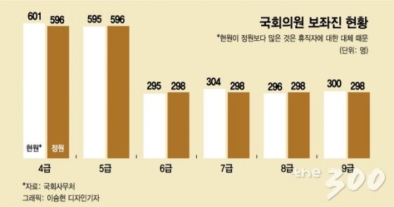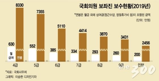 ◇국회 보좌진 보수는…4급 8330만원 =국회의원들은 8명의 보좌직원과 1명의 인턴을 둘 수 있다. 4급 보좌관 2명, 5급 비서관 2명, 6~9급 비서 각 1명씩이다.