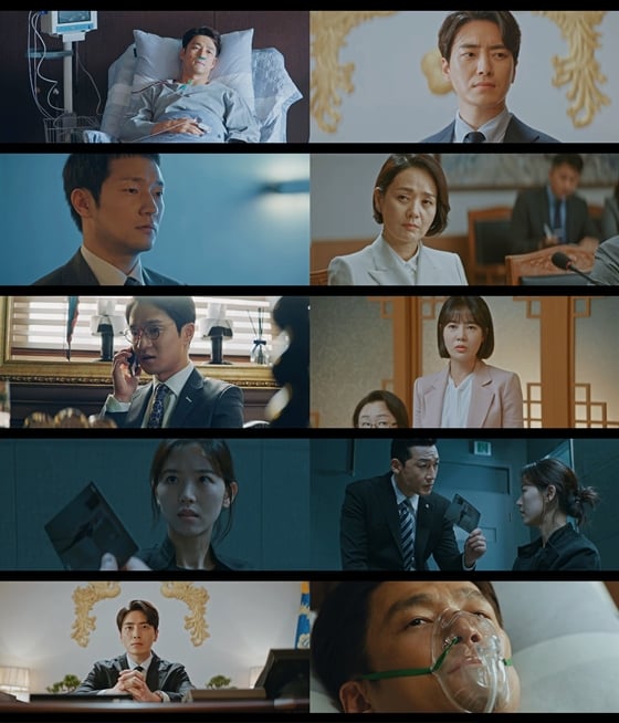 이날 방송에서 태익(최영우 분)이 쏜 총에 맞고 급히 병원으로 이송된 박무진(지진희 분). 총알 파편에 대동맥이 파열돼 10시간 이상 수술을 받아야 하는 위급한 상황이었다. 국정 공백을 막기 위해 박무진을 대신할 권한대행 지정이 불가피했지만, 문제는 헌법상 승계서열 1위인 기획재정부장관 또한 빗나간 줄 알았던 첫 번째 총격으로 부상을 입었다는 것. 다음 승계서열은 바로 국방부장관 오영석(이준혁 분). 그렇게 박무진이 수술실로 들어간 그 시각, 오영석은 청와대에 입성했다.