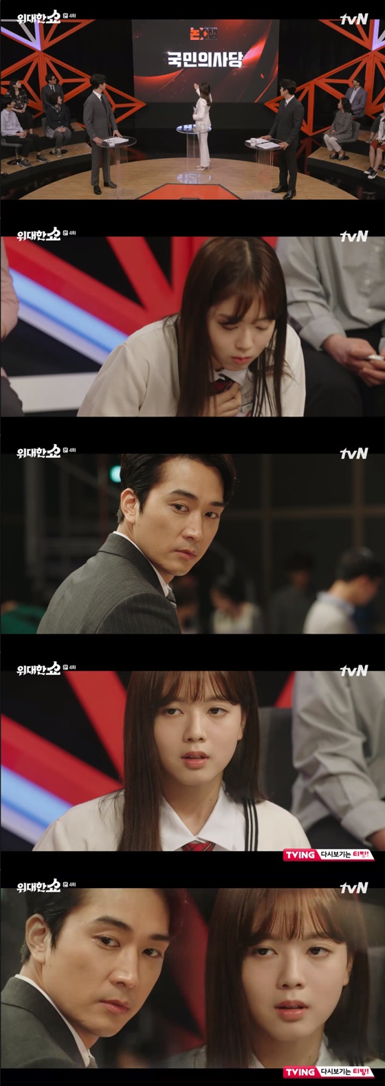 3일 오후 방송된 tvN 월화드라마 '위대한 쇼'(극본 설준석, 연출 신용휘·김정욱)에서는 '국민아빠'로 이미지 변신에 성공한 위대한(송승헌 분)이 정치 토크쇼 '논쟁'에 패널로 합류하는 내용이 그려졌다.