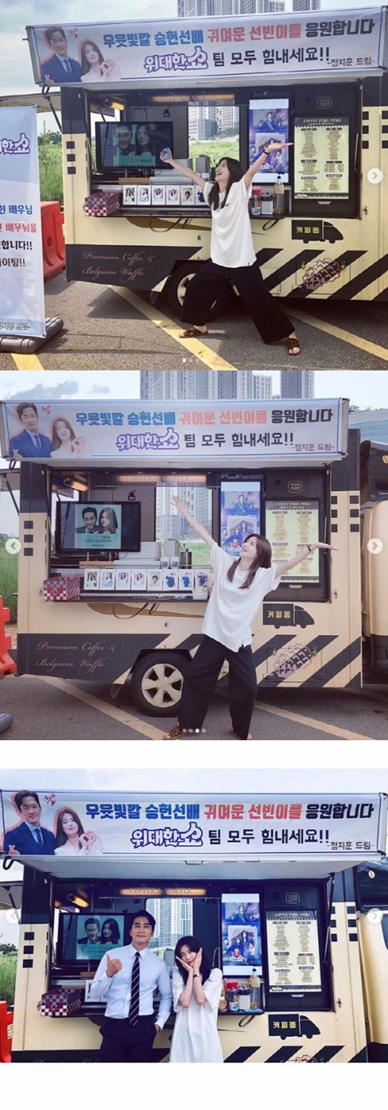 또 다른 사진에서 이서빈은 꽃받침 포즈를 하고 '위대한 쇼'에 함께 출연 중인 송승헌과 나란히 서서 커피 차를 보낸 정지훈에게 고마움을 전했다.