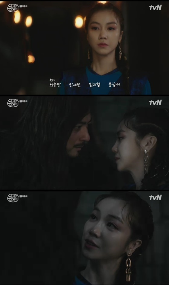 22일 오후 방송된 tvN 주말 드라마 '아스달 연대기'에서 태알하(김옥빈 분)가 타곤(장동건 분)에게 "타곤의 아이를 가졌다"고 밝혔다.