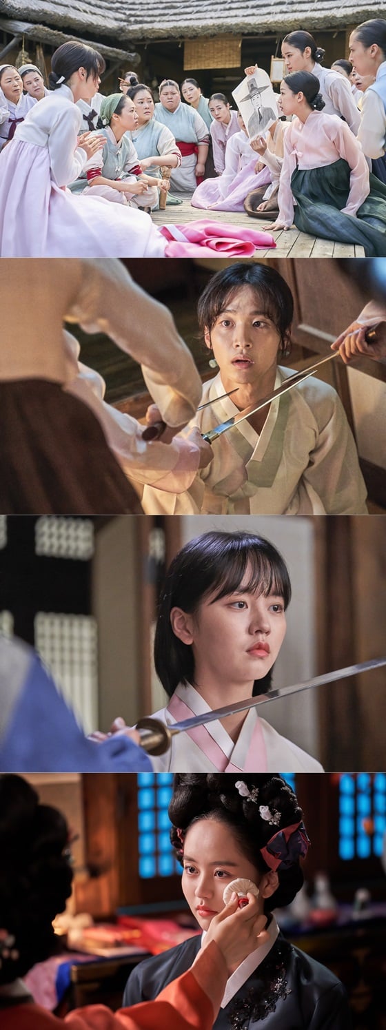 그런 가운데 공개된 사진 속 위기에 놓인 녹두와 동주가 긴장감을 높인다. 살수의 뒤를 밟아 과부촌에 입성한 녹두. 본인의 용모파기를 두고 들썩이는 과부촌 여인들과 섞여 앉아 있는 녹두의 모습이 흥미를 유발한다. 잡히면 순순히 보내줄 것 같지 않은 열녀단(윤사봉, 황미영, 윤금선아)의 포스와 녹두를 의심의 눈초리로 바라보는 들레(송채윤 분)의 눈빛이 정체를 들킬까 손에 땀을 쥐게 한다. 이어 세 개의 칼날 앞에 무릎을 꿇은 녹두가 포착됐다. 금남의 구역 과부촌 속, 여장남자라는 치명적 비밀을 숨긴 녹두인 만큼 정체가 발각된 것인지 궁금증을 고조시킨다.