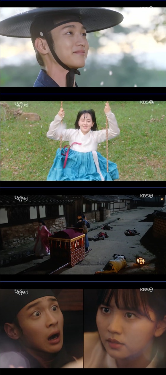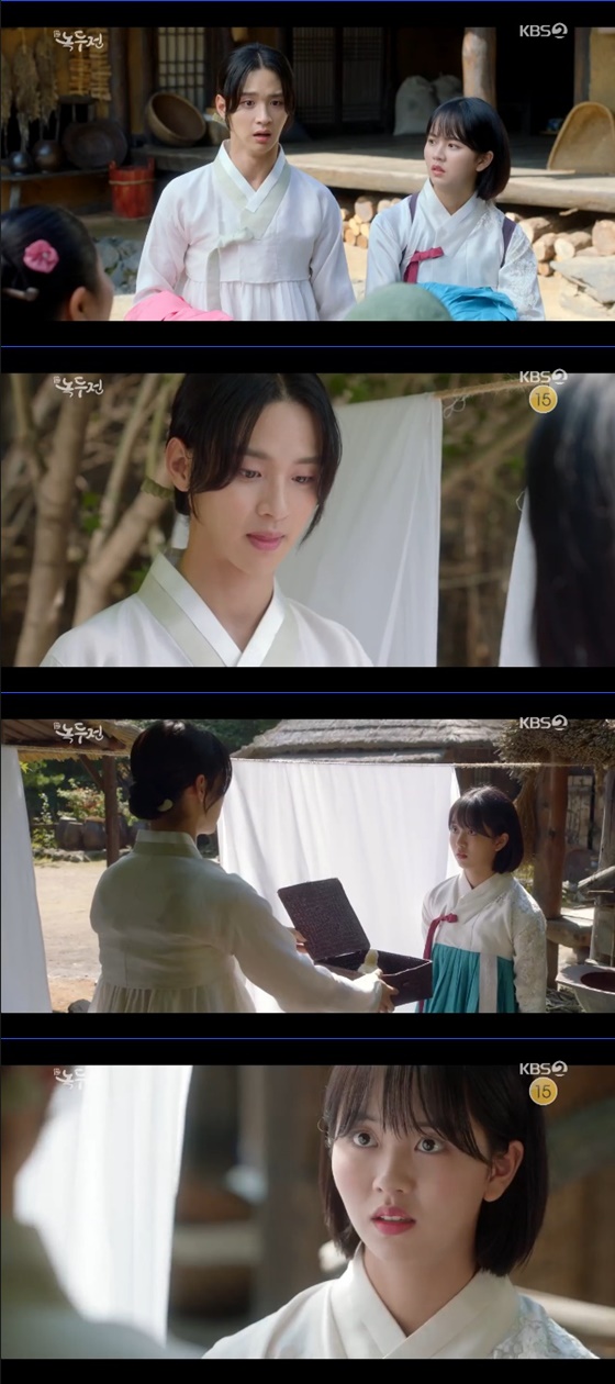 이후 전녹두는 동동주가 만들어준 활을 통해 코기리를 획득했다. 동동주는 전녹두와 마주쳤던 그 집으로 다시 향했다. 알고보니 그 집은 과거 동동주가 살았던 집이였다. 동동주는 그 곳에서 차율무(강태오 분)과 단 둘이 만나게 됐다. 동동주는 차율무에게 이 곳에 다시 안 오겠다고 말했다. 이 곳에 오면 다시 예전으로 돌아가고 싶기 때문이라고. 두 사람의 모습을 목격한 전녹두는 "아니 이 늦은 밤에 단 둘이 빈집에서 뭐하는 거래? 동동주 기방에선 찬바람 쌩생 불더니 아주 딴 사람이네"라고 혼잣말 했다.