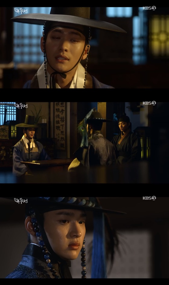 12일 오후 방송된 KBS 2TV 월화드라마 '조선로코-녹두전'(연출 김동휘·강수연, 극본 임예진·백소연)에서는 전녹두(장동윤 분)에게 광해(정준호 분)에 대한 복수를 위해 자신과 손을 잡지 않겠냐고 제안하는 차율무(강태오 분)의 모습이 그려졌다.