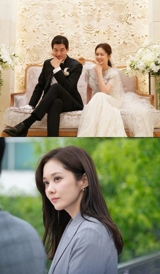 또 다른 사진에서 장나라는 웨딩 드레스를 입고 이상윤과 함께 나란히 밝게 웃고 있다. 장나라와 이상윤은 손가락으로 브이를 그리는 포즈를 취하며 카메라를 향해 장난스러운 표정을 지었다. 특히 실제 부부 관계를 연상케 하는 두 사람의 케미가 많은 이들의 눈길을 끈다.