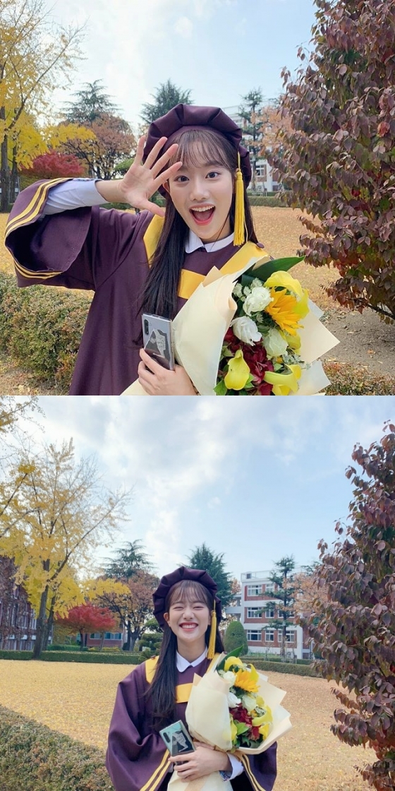 공개된 사진 속 이나은은 졸업식 가운을 입고 학사모를 쓴 채 꽃다발을 안고 있다. 특히 이나은은 특유의 익살스러운 미소를 띄고 있어 사랑스러움을 보여줬다.