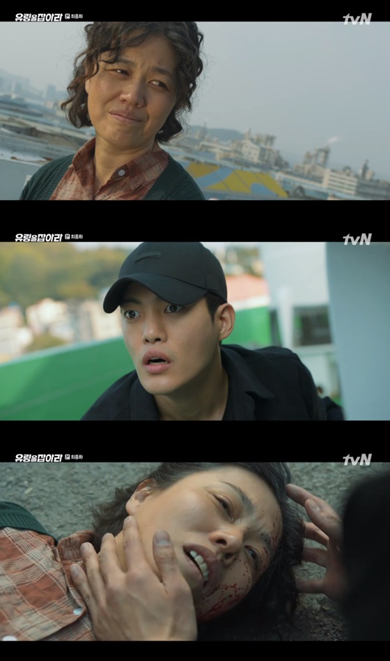 10일 오후 방송된 tvN 월화드라마 '유령을 잡아라'(극본 소원·이영주, 연출 신윤섭)에서는 아들 김이준(김건우 분)이 연쇄살인마라는 충격에 건물 옥상에서 떨어져 내리는 최경희(김정영 분)의 모습이 그려졌다.