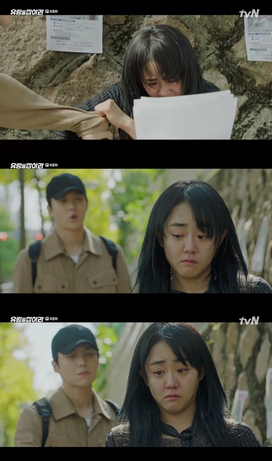 10일 오후 방송된 tvN 월화드라마 '유령을 잡아라'(극본 소원·이영주, 연출 신윤섭)에서는 기찻길 사고로 죽은 줄 알았던 유진(문근영 분)을 마주치고 그녀에게 유령(문근영 분)을 만나달라고 부탁하는 고지석(김선호 분)의 모습이 그려졌다.