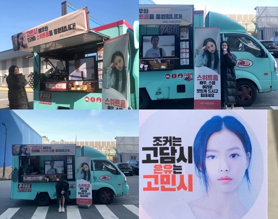 공개된 사진 속 고민시는 수호가 선물한 추로스 차 앞에서 입을 막고 환하게 웃고 있다. 자신의 현수막 옆에서 사진을 찍거나 카메라를 향해 인사하는 모습도 담았다.