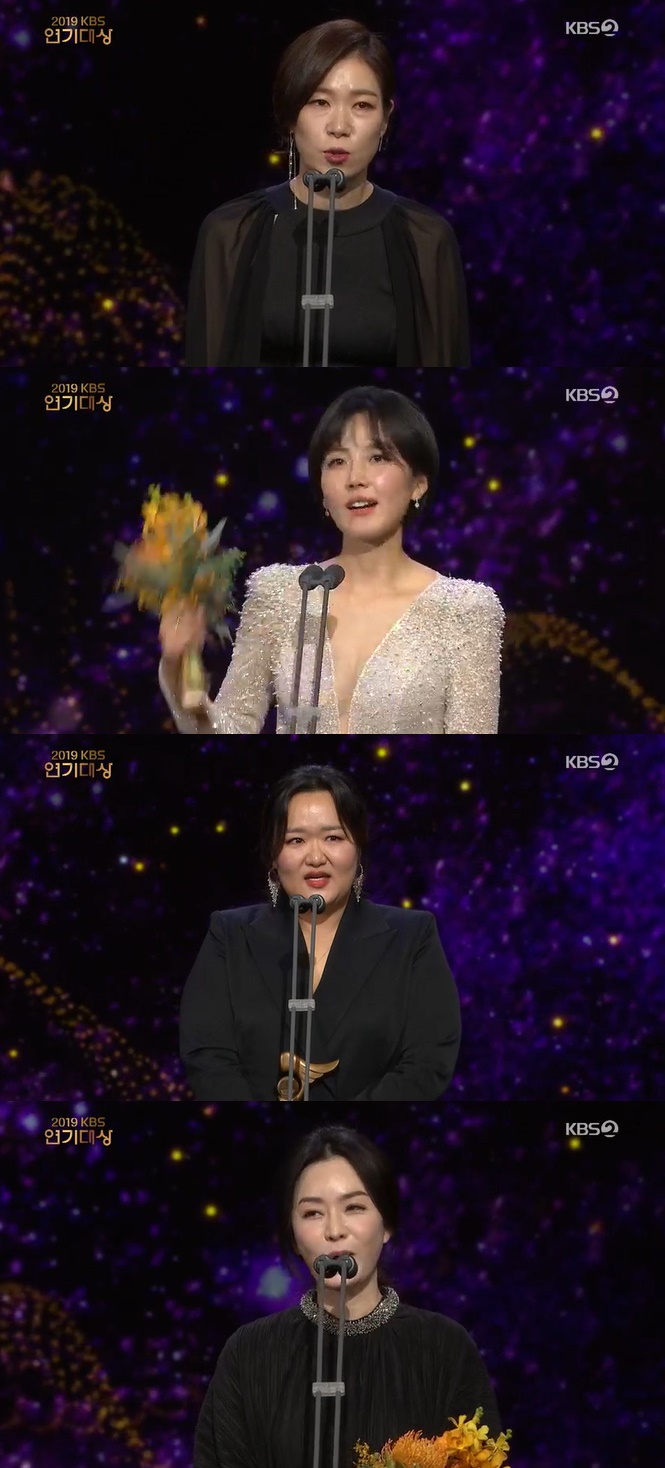 '동백꽃 필 무렵' 염혜란은 "부족한 저에게 큰 상 주셔서 감사하다. 감독님, 스태프, 시청자들 덕분에 상을 받았다"며 "처음 이 작품을 할 때 두려웠다. 고학력자 역이기 때문이다. 완주할 수 있었던 건 이 많은 분들 덕분이다. '옹벤져스'를 비롯한 조연분들을 대표해서 상을 주신 것으로 생각한다"고 말했다.