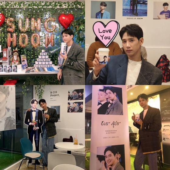 공개된 사진 속 박성훈은 자신의 얼굴이 새겨진 커피 컵 홀더를 턱에 대며 미소 짓고 있다. 또 자신의 등신대와 현수막 옆에서 조각 같은 외모로 인증 사진을 찍어 눈길을 끌었다.