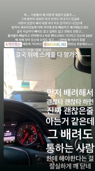 이어 "밤까지 세워져 있길래 어제 저녁에 분명 빼달라고 이야기해놨는데도 결국 지금까지 빼지도 않고 집에도 없고 전화도 안 받고. 물어물어 빼달라고 연락했더니 바로 뺀다고 해서 기다리고 있는데 30분째 차에 앉아 있는데 오지도 않고. 나한테 왜 이러지 정말"이라며 분노했다.