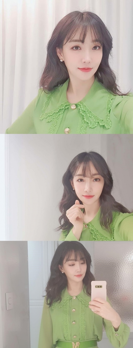 공개된 사진 속 이유리는 앞머리를 내고 머리에 전체적으로 굵은 웨이브를 줘 우아하면서도 귀여운 모습을 보여줬다. 이어 연두색 레이스 원피스를 입어 봄에 새싹이 돋는 듯한 코디를 보였다.