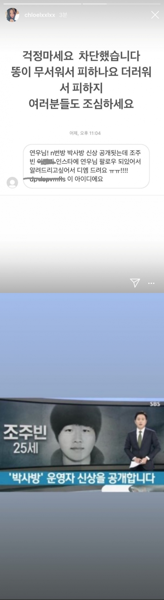 그룹 모모랜드 출신 배우 연우가 '텔레그램 n번방 사건'에서 가장 큰 규모로 피해를 끼쳤던 핵심 피의자인 '박사' 조주빈의 아이디로 추정되는 SNS 계정을 차단했다고 밝혔다.