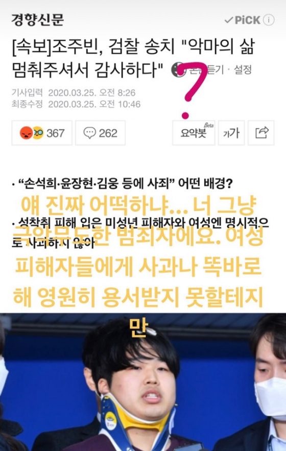 손수현이 게재한 인스타그램 스토리에는 텔레그램 n번방 운영자인 조주빈을 다룬 한 매체의 기사가 올라와 있다. 손수현은 '얘 진짜 어떡하냐. 너 그냥 극악무도한 범죄자예요. 여성 피해자들에게 사과나 똑바로 해. 영원히 용서받지 못할 테지만'이라고 썼다.