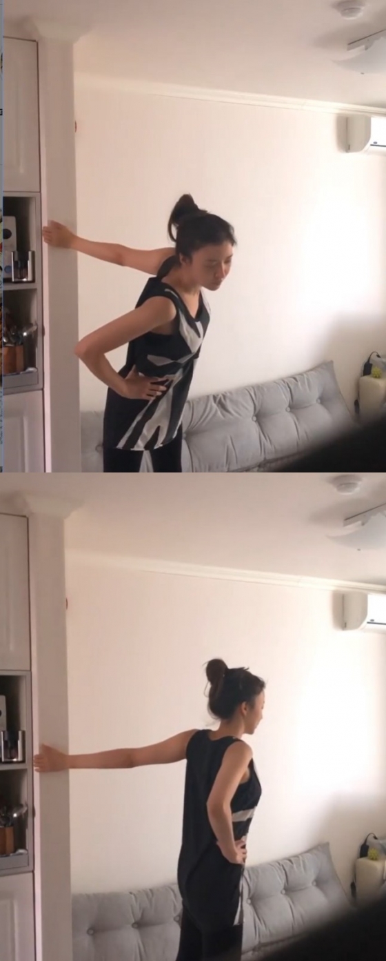공개된 영상 속 윤세아는 벽을 잡고 팔과 어깨 운동을 하고 있다. 유연한 포즈가 눈에 띈다.