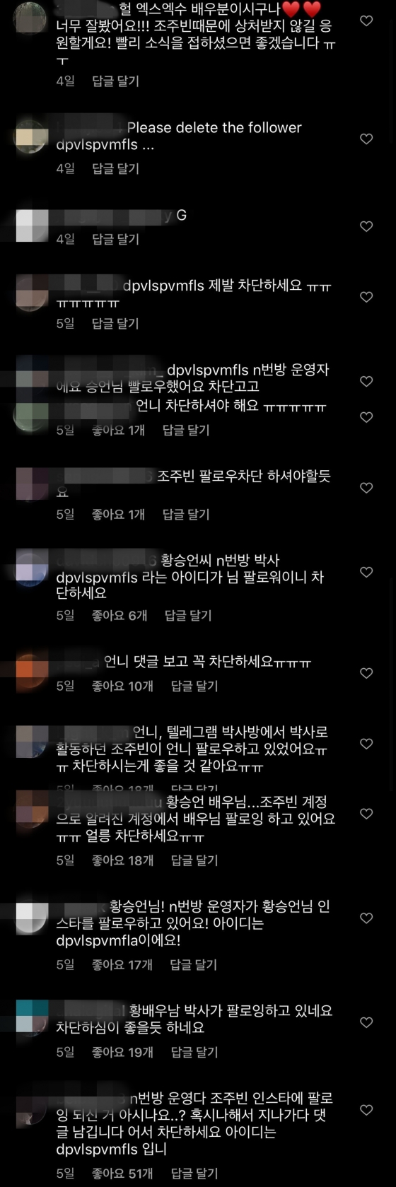 이에 네티즌들은 "확인하셔서 다행이에요", "눈 부릅뜨고 찾았는데 없는 거 같다.. 그래도 누나가 보고 차단하신 거 같아서 다행입니다", "울 언니는 우리가 지킨다♥" 등 댓글을 달며 황승언에 대한 사랑을 드러냈다.