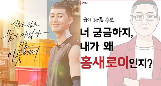 홍준표 후보 선거운동본부는 홍준표 후보를 '박새로이'를 따라 '홍새로이'로 내세우는 이유도 들었다. 박새로이와 홍 후보가 어린 시절부터 비슷한 길을 걸어왔다는 것.
