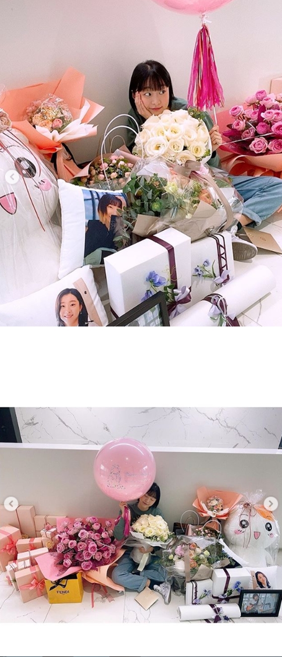 공개된 사진 속에는 팬들에게 받은 생일 선물과 함께 인증 사진을 찍는 김다미의 모습이 담겼다. 김다미는 단발머리를 한 채 꽃다발을 들고 사랑스러움을 뽐냈다.