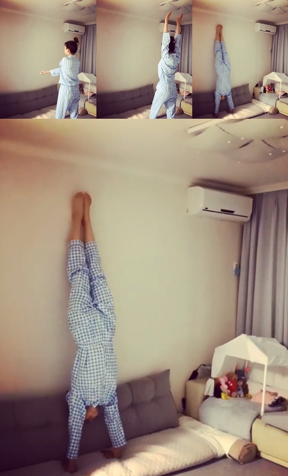 공개된 영상 속에는 잠옷을 입고 두 팔을 위로 뻗은 채 소파 앞에 서있는 윤세아가 담겼다. 윤세아는 짧은 준비 운동 끝에 가뿐하게 손을 짚고 물구나무 서기를 성공했다. 그의 가벼운 몸놀림에 많은 이들의 시선이 집중됐다.