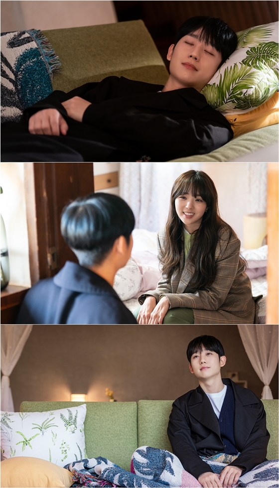 이 가운데 공개된 스틸 속에는 텅 비어있던 예전과는 달리 따스한 온기가 느껴지는 가구들로 꽉 채워진 배송지의 모습이 담겨있어 눈길을 끈다. 이에 정해인은 달콤한 미소를 머금은 채 잠이 드는가 하면, 채수빈은 배송지의 변화가 만족스러운지 해사한 웃음을 띤 표정으로 시선을 사로잡는다. 더욱이 정해인은 그 여느 때보다 평온하고 여유로운 표정으로 보는 이들까지 미소 짓게 한다.