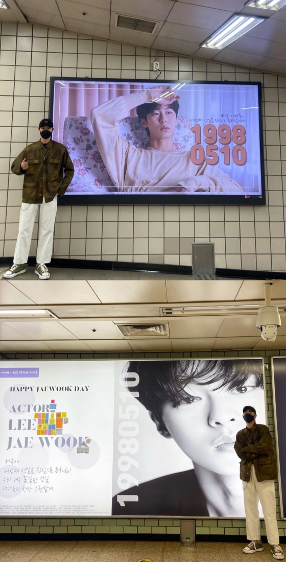 공개된 사진 속에는 팬들이 준비한 지하철 전광판 생일 축하 이벤트를 직접 보기 위해 나선 이재욱의 모습이 담겨있다. 이재욱은 모자와 마스크를 쓴 채 해당 전광판 앞에서 포즈를 취하고 있다.