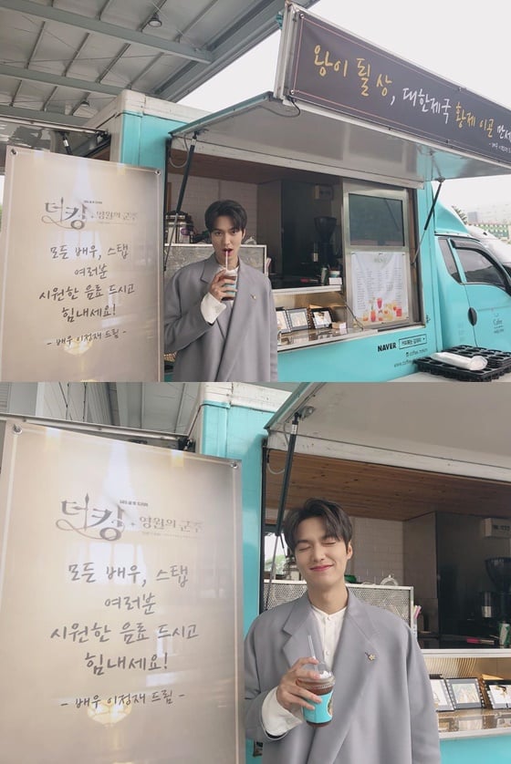 이민호에게 간식차를 보낸 건 다름 아닌 배우 이정재다. 이정재는 간식차 현수막을 통해 '왕이 될 상, 대한제국 황제 이곤 만세'라고 응원했다. 뿐만 아니라 '더 킹: 영원의 군주' 모든 배우와 스태프들에게도 응원의 메시지를 전했다.