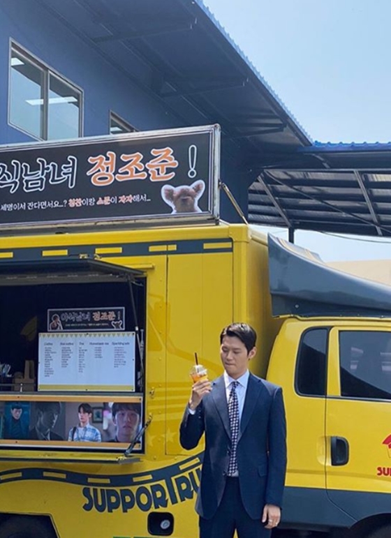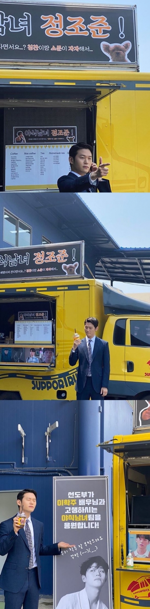 공개된 사진 속에는 이학주의 팬들이 드라마 '야식남녀' 촬영을 응원하기 위해 선물한 커피차 앞에서 인증샷을 찍는 이학주의 모습이 담겼다. 이학주는 밝은 표정으로 팬들에 감사를 전하며 대세를 입증했다.