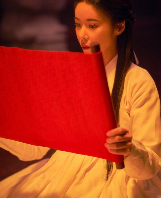 공개된 사진 속 황정음은 하얀 소복을 입고 날카로운 눈빛으로 뭔가를 읽고 있는 모습이다.