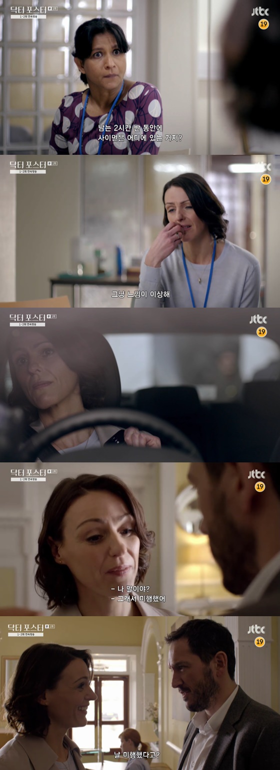 29일 오후 JTBC에서 특별 방송된 영국 BBC 드라마 '닥터 포스터 시즌1'에서는 젬마 포스터(슈란느 존스)가 건축가인 남편 사이먼 포스터(버티 카벨 분)의 외도를 의심하고 미행했다.