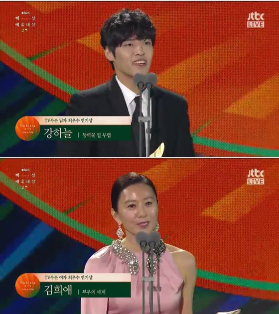 배우 강하늘, 김희애가 2020년 제 56회 백상예술대상 TV부문 남녀 최우수 연기상을 수상하는 영광을 안았다.