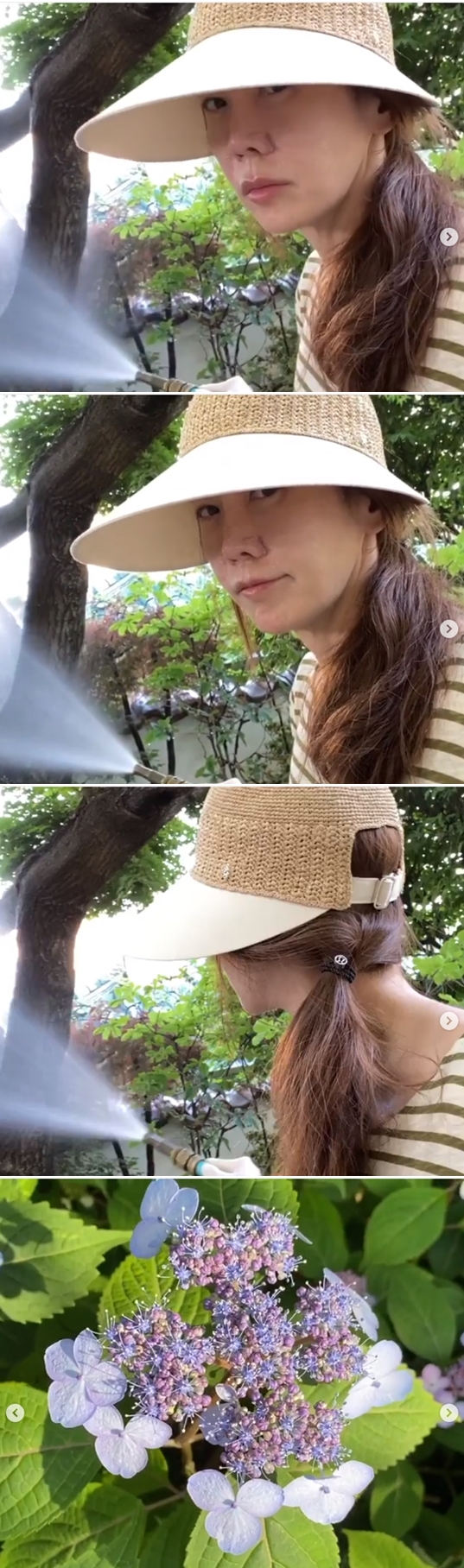 김정은은 10일 자신의 SNS에 정원에 물을 주고 있는 영상과 사진을 공개했다.