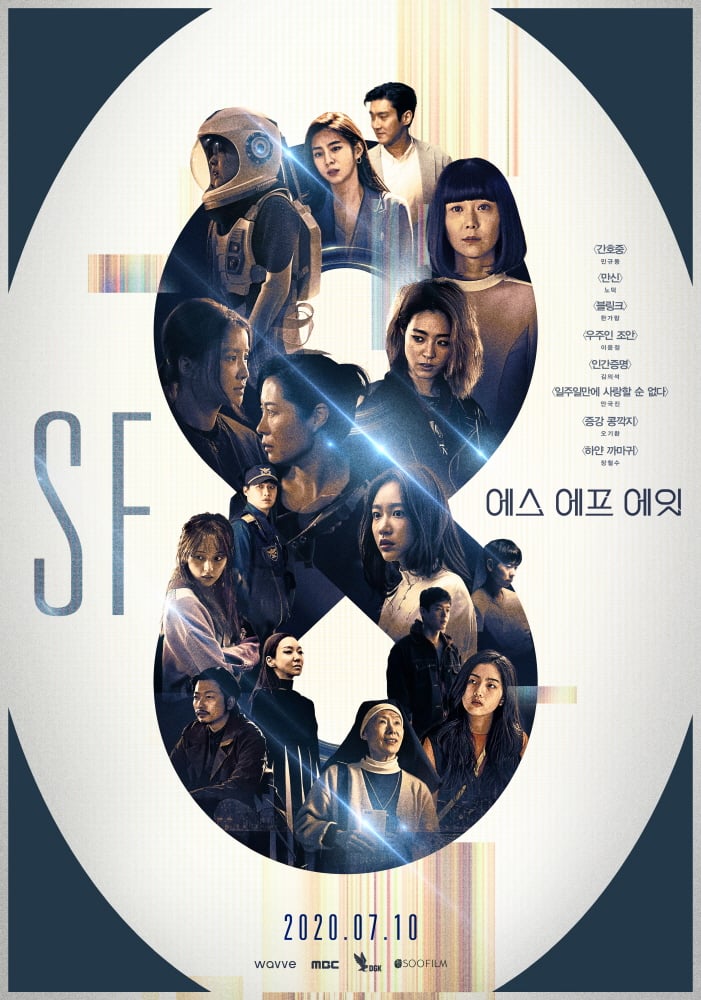 'SF8'은 △돌봄 대상 중 누구를 살려야 할지 고뇌에 빠지는 인간보다 더 인간적인 간병 로봇 이야기 '간호중'(민규동 감독) △인공지능 파트너를 뇌에 이식해 살인 사건 수사에 나서는 형사 이야기 '블링크'(한가람 감독) △미세먼지로 인해 계급이 나뉜 세상 청춘들의 이야기를 그린 '우주인 조안'(이윤정 감독) △인공지능 운세 서비스에 의존하게 되는 사람들의 이야기 '만신'(노덕 감독) △가상세계에 갇혀버린 BJ의 이야기를 그린 '하얀까마귀'(장철수 감독) △증강현실 앱으로 서로의 얼굴을 속이고 만난 남녀의 리얼 공감 로맨스 '증강콩깍지'(오기환 감독) △지구 종말을 막기 위한 초능력자들의 로맨스를 그린 '일주일 만에 사랑할 순 없다'(안국진 감독) △안드로이드가 아들의 영혼을 죽였다고 의심하는 엄마의 이야기 '인간증명'(김의석 감독) 등 8개 에피소드로 구성됐다.