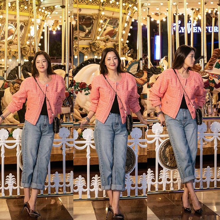 공개된 사진 속 김희선은 회전목마 앞에서 포즈를 취하고 있다. 분홍색 트위드 재킷에 7부 와이드 청바지로 캐주얼하고 젊은 패션을 선보였다.
